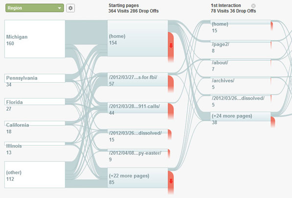 Creepy, right? Max of 12 interactions for the users who browsed the longest, and those flows represent how they browsed the site. Each red “waterfall” represents people clicking “x” and telling me to virtually fuck off.