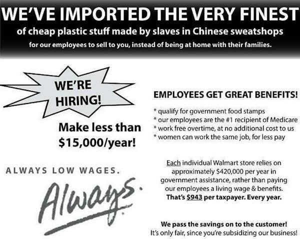 Walmart doesn’t give a rat’s ass about you, me, or society. This one, to me, seems like a no brainer. All of the community garbage you see posted on the walls of each Walmart store is essentially a shield. It’s public relations nonsense to keep people shopping, despite the incredibly poor working conditions suffered by those who are unable to obtain gainful employment. Walmart, from highest tiers of management, to the lowest of low, knows the score. Everyone knows the drudges of Walmart are mistreated and expendable. It’s common knowledge at this point. How else can they operate so many large stores with the lowest cost of overheard since the laying of the Pacific Railroad?